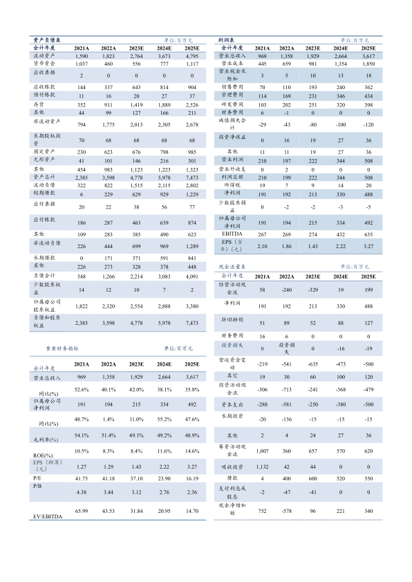 盈利预测:预计2023-2025年公司收入分别为19.29/26.64/36.17亿元,同比增长42.0%/38.1%/35.8%。归母净利润分别为2.15/3.34/4.92亿元,同比增长11.0%/55.2%/47.6%,对应2023-2025年EPS分别为1.43/2.22/3.27元,PE为37/24/16倍。