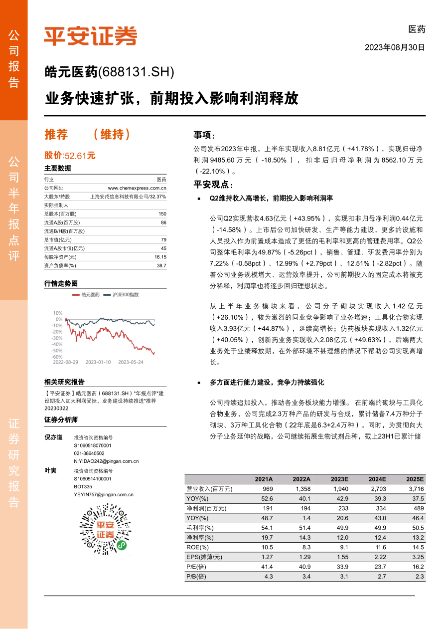 皓元医药2023年中报显示,公司正处于业务快速扩张和能力建设的关键时期。虽然前期投入对利润释放造成一定压力,但公司在分子砌块、工具化合物、仿药和创新药等业务板块均保持了较好的增长势头。随着公司规模扩大和运营效率提升,前期投入的固定成本将被充分稀释,利润率有望逐步回归理想状态。维持“推荐”评级,看好公司中长期发展前景。