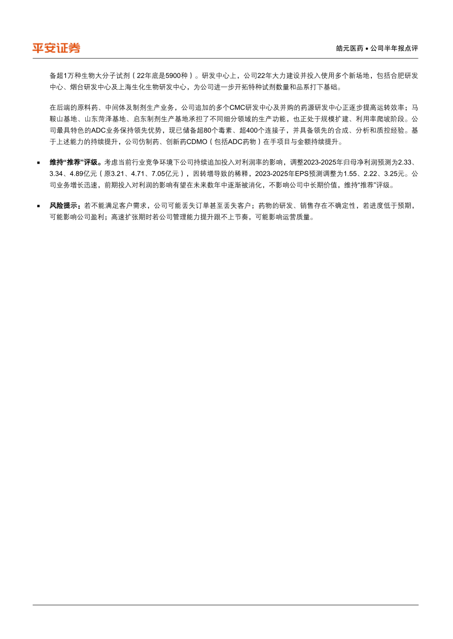 风险提示:若不能满足客户需求,公司可能丢失订单甚至丢失客户;药物的研发、销售存在不确定性,若进度低于预期,可能影响公司盈利;高速扩张期时若公司管理能力提升跟不上节奏,可能影响运营质量。