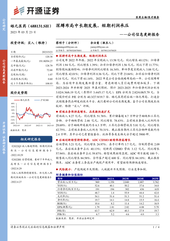 皓元医药在2022年通过深蹲布局实现了收入的快速增长,但由于战略性投入导致费用增加,短期利润承压。公司前端业务在分子砌块和工具化合物领域保持高增长并持续扩充品类,后端业务则通过创新转型,特别是ADC CDMO业务,展现出强劲的增长势头和巨大的发展潜力。尽管面临产能爬坡、人效提升和行业竞争等风险,但鉴于公司前后端一体化布局和全流程服务药品研发技术平台的打造,开源证券维持“买入”评级,看好其长期成长性。
