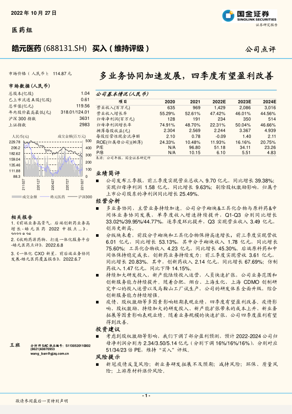 皓元医药通过多业务协同发展,实现了收入的稳健增长,尤其是在分子砌块和工具化合物等前端业务方面表现突出。尽管短期内受到多种因素影响,盈利能力有所承压,但随着业务规模的扩张和新产能的释放,预计四季度盈利将有所改善。维持“买入”评级,但需关注疫情、研发、减持、环保及原材料涨价等风险。