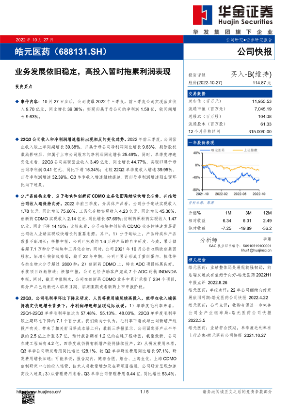 投资建议:公司三季报是略低于预期的。但分拆来看,公司业务发展还是较为稳定,收入端继续保持较快增长;利润端的下滑预计主要是因新增产能投产、研发扩容、股权激励实施等成本费用高投入所致。短期来看,由于新增产能依旧将陆续释放、股权激励将继续逐季摊销、产品线扩容也将持续推进,高投入或将延续,并略微影响公司暂时的业绩表现;而中长期,当前公司正在进行的研发、人员、产能等投入都将有助于夯实公司的行业竞争力,完善药研全产业链布局,公司总体发展向好依旧可期。综合考虑,我们略微下调公司的盈利预测,预计2022年至2024年每股收益分别为2.11、3.67和5.96元,维持公司买入-B的投资评级。