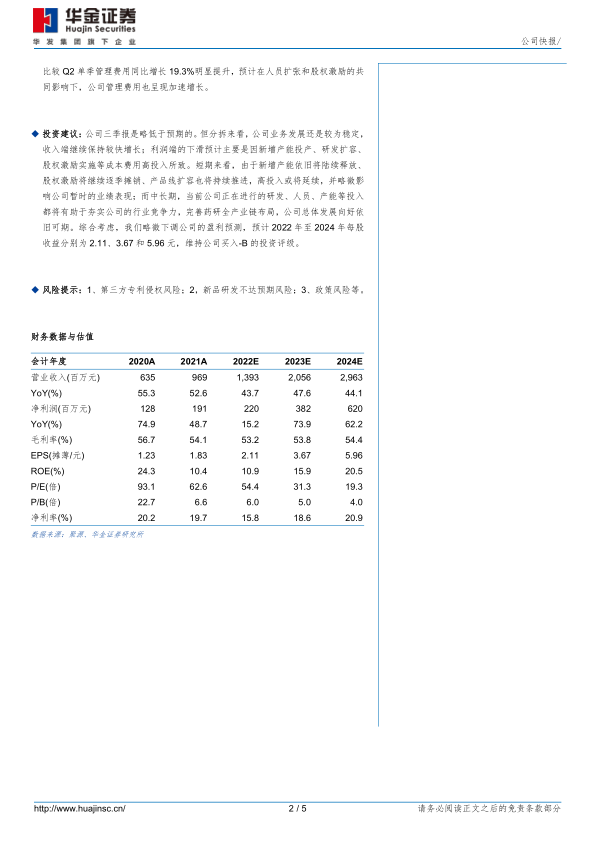 综合考虑,华金证券略微下调了公司的盈利预测,预计2022年至2024年每股收益分别为2.11元、3.67元和5.96元,并维持公司“买入-B”的投资评级。