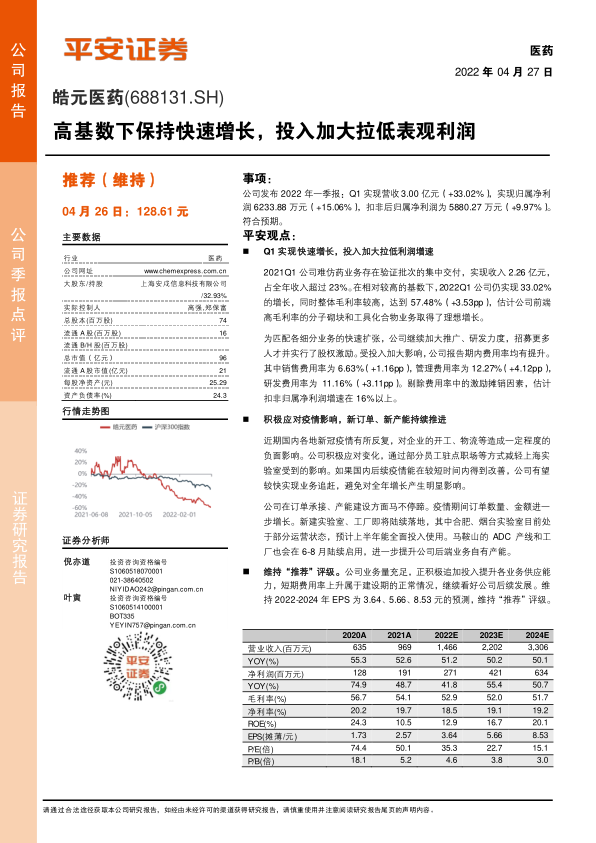 皓元医药2022年一季度在高基数下保持了快速增长,营收表现亮眼,但由于加大了推广和研发投入,导致利润增速有所放缓。公司积极应对疫情影响,持续推进订单承接和产能建设,新建实验室和工厂预计将陆续投入使用。平安证券维持对公司2022-2024年的盈利预测,并维持“推荐”评级,看好公司后续发展。