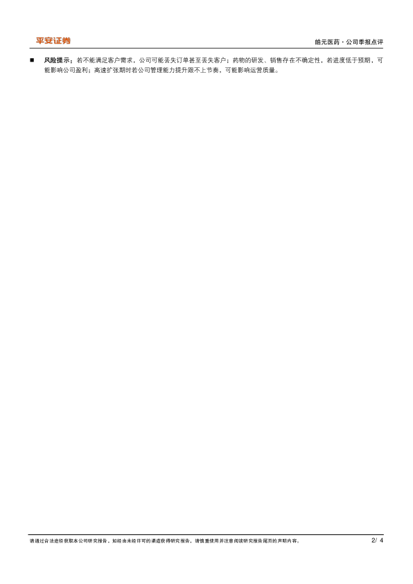 风险提示:若不能满足客户需求,公司可能丢失订单甚至丢失客户;药物的研发、销售存在不确定性,若进度低于预期,可能影响公司盈利;高速扩张期时若公司管理能力提升跟不上节奏,可能影响运营质量。