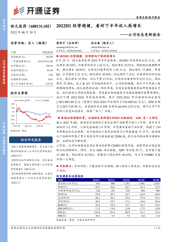 皓元医药在2022年上半年展现出强劲的经营韧性,在疫情挑战下实现了营收和利润的显著增长,尤其前端业务表现突出,后端创新药CDMO转型成效显著。公司通过持续扩充产品种类、深化创新药CDMO布局(特别是ADC领域),并积极进行产业扩张与投资收购,全面提升了研发和服务能力。尽管短期内因战略性投入导致利润增速略低于收入,但这些举措为公司长期发展奠定了坚实基础。分析师维持“买入”评级,并预计公司下半年收入将加速增长,但需关注专利、产能、人才及环保等潜在风险。