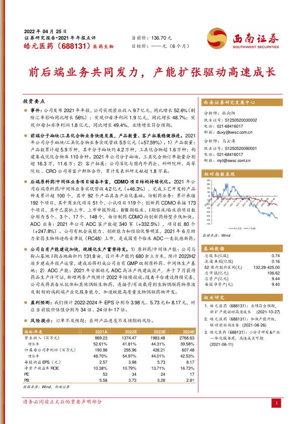 皓元医药在2021年取得了显著的财务成就,营业收入和净利润均实现高速增长,这主要归因于其前端分子砌块/工具化合物业务的强劲表现和后端原料药/中间体业务的持续优化。公司在创新药CDMO领域,特别是ADC业务方面,展现出强大的增长潜力和技术优势。通过马鞍山基地和安徽皓元ADC高活产线的建设,公司正积极扩大自有产能,旨在构建全面的生物偶联药物端到端服务能力。尽管存在订单和研发进度不及预期的潜在风险,但公司在业务结构优化和产能扩张方面的战略布局,预计将持续驱动其未来的高速成长。