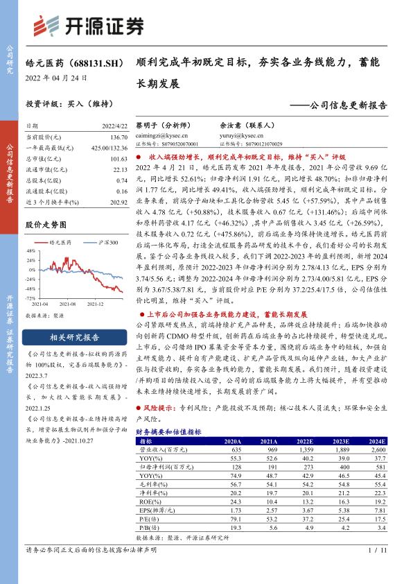 皓元医药在2021年实现了显著的业绩增长,营收和净利润均大幅提升,并成功完成了年度目标。公司通过前后端一体化布局,持续扩充前端产品种类并强化品牌效应,同时加速后端业务向创新药CDMO转型,创新药项目占比显著提高。上市后,公司积极利用资本市场力量,通过一系列产业扩张和投资收购,全面提升了研发能力和产能,为未来的持续快速增长奠定了坚实基础。尽管短期内毛利率受战略转型和汇兑因素影响有所波动,但长期盈利能力有望恢复。基于对公司长期发展前景的看好以及当前估值的吸引力,开源证券维持其“买入”评级,并对未来盈利能力持乐观预期,但同时提示了专利、产能、人才和环保安全等潜在风险。