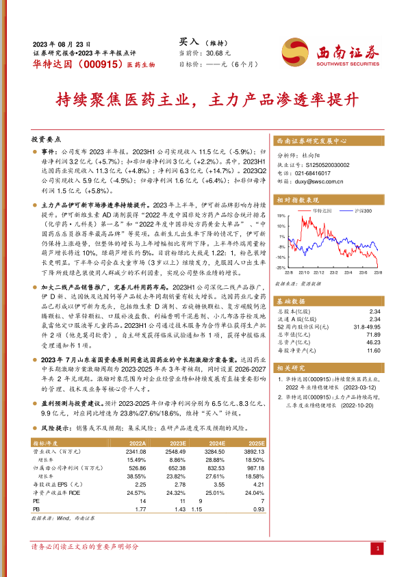 华特达因2023年上半年业绩表现稳健,主力产品伊可新市场渗透率持续提升,二线产品推广力度加大,儿科用药布局逐步完善。公司积极推进新药研发和技术服务,并实施中长期激励方案,有望进一步激发企业活力。维持“买入”评级,但需关注销售不及预期、集采风险以及在研产品进度等风险因素。