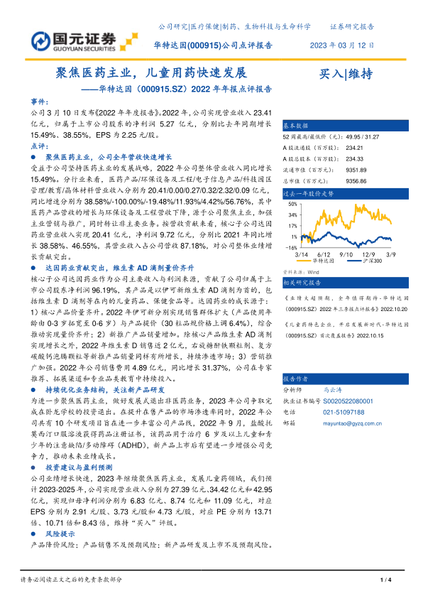 2022年年报点评报告:聚焦医药主业,儿童用药快速发展