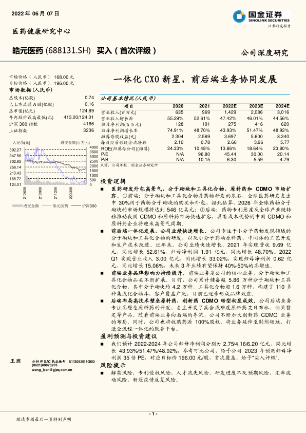 前后端一体化发展,公司业绩快速增长。公司专注于小分子药物发现领域的分子砌块和工具化合物的研发,以及小分子药物原料药、中间体的工艺开发和生产技术改进。近年来,公司业绩快速增长,2021年实现营收9.69亿元,同比增长52.61%,归母净利润1.91亿元,同比增长48.70%。2022Q1实现营业收入3.00亿元,同比增长33.02%,实现归母净利润0.62亿元,同比增长15.06%,未来3年业绩有望保持40%-50%的高增速。