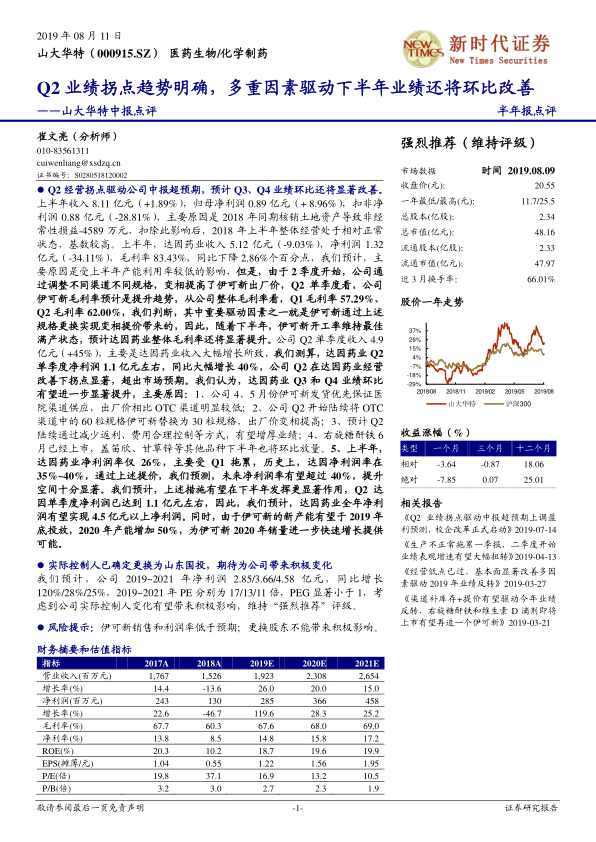 山大华特2019年Q2业绩表现强劲,标志着公司经营已进入明确的拐点。核心子公司达因药业通过产品结构调整和渠道优化,实现了盈利能力的显著提升,预计全年净利润有望突破4.5亿元。随着伊可新新产能的投放、新产品的放量以及实际控制人变更为山东国投,公司未来增长潜力巨大。尽管存在销售和利润率不及预期以及股东变更影响不确定的风险,但基于当前积极的经营态势和有利的战略调整,公司整体发展前景乐观,维持“强烈推荐”评级。