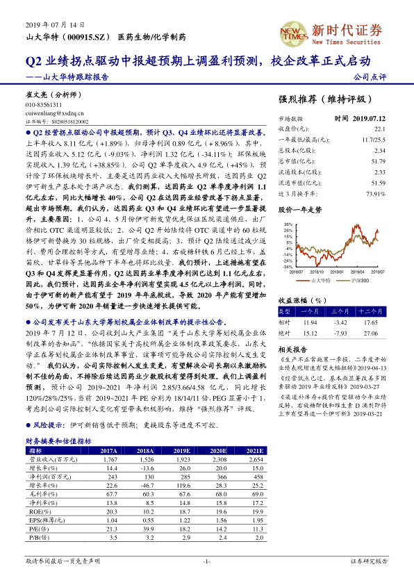 本报告核心观点指出,山大华特在2019年第二季度实现了显著的经营业绩拐点,特别是达因药业的强劲复苏,驱动公司上半年业绩超预期。基于此,分析师上调了公司2019年至2021年的盈利预测,预计净利润将分别同比增长120%、28%和25%。