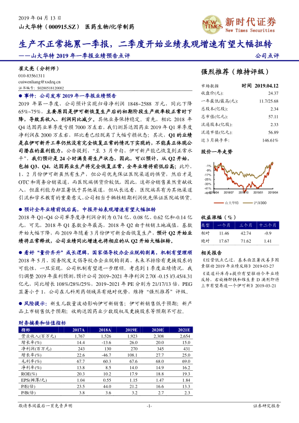 山大华特2019年第一季度业绩因核心产品伊可新生产效率暂时性下降而同比下滑,但其核心子公司达因药业已实现环比盈利扭转,且伊可新产能已于3月中旬全面恢复。预计公司全年业绩将呈现“前低后高”的趋势,从第二季度开始业绩增速有望大幅扭转。分析师看好公司在儿科用药领域的“量价齐升”成长逻辑,并认为校办企业脱钩剥离政策可能进一步理顺公司机制。基于此,分析师上调了未来三年的盈利预测,并维持“强烈推荐”评级,认为公司当前估值具有吸引力。同时,报告也提示了新生儿数量波动、产品销售不及预期以及股权变动等潜在风险。