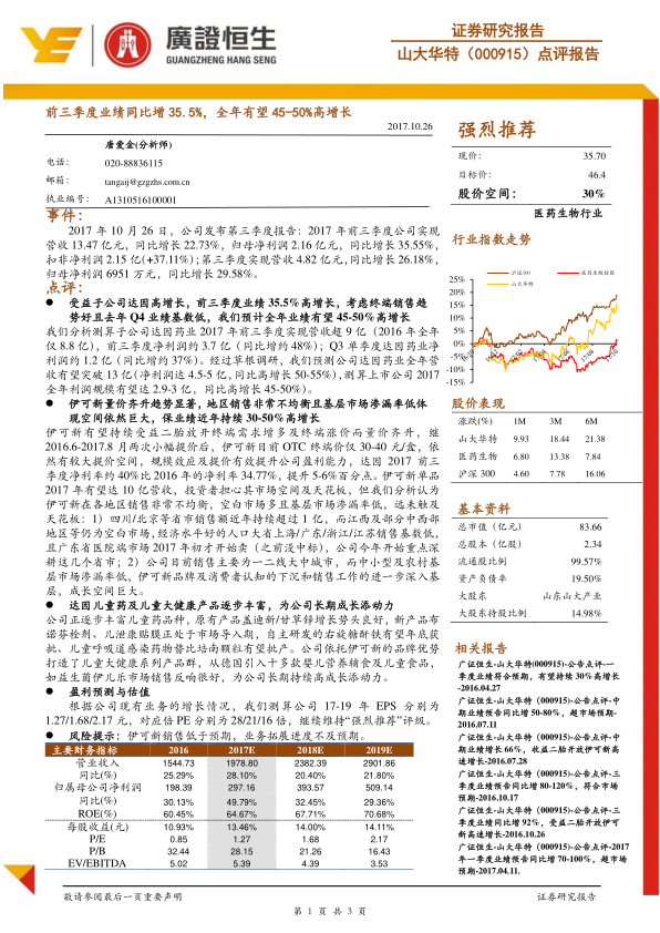 山大华特(000915)在2017年前三季度展现出强劲的业绩增长,归母净利润同比增长35.55%,主要得益于子公司达因药业的卓越表现。核心产品伊可新通过量价齐升策略和广阔的市场渗透空间,持续贡献高增长。同时,公司积极布局儿童药及大健康产品线,为未来发展注入新动能。分析师预计公司全年业绩有望实现45-50%的高增长,并维持“强烈推荐”的投资评级,认为公司具备显著的投资价值和成长潜力。