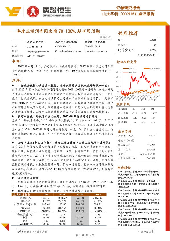 山大华特2017年一季度业绩表现亮眼,归母净利润同比增长70%-100%,超出市场预期。这一增长主要得益于二胎政策对核心产品伊可新需求的强劲拉动以及成功的提价策略。公司积极布局儿童大健康产品线,通过母婴事业部和新品推广,有望在辅食、洗护等领域实现业务规模的快速增长。预计未来2-3年公司业绩将持续保持高增长态势,达因制药营收和业绩增长率均有望维持在较高水平。鉴于其强劲的增长潜力和市场地位,报告维持“强烈推荐”的投资评级,但同时提示了伊可新销售和业务拓展不及预期的风险。