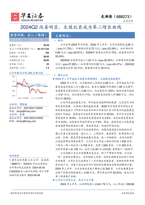 麦澜德公司2024年上半年业绩表现亮眼,Q2改善明显,生殖抗衰业务成为新的增长点。公司战略聚焦女性健康和美,积极拓展市场,加大研发投入,巩固技术优势。华安证券维持对麦澜德“买入”评级,并预计公司未来几年将保持快速增长。投资者应关注新产品研发推广进度和市场竞争风险。