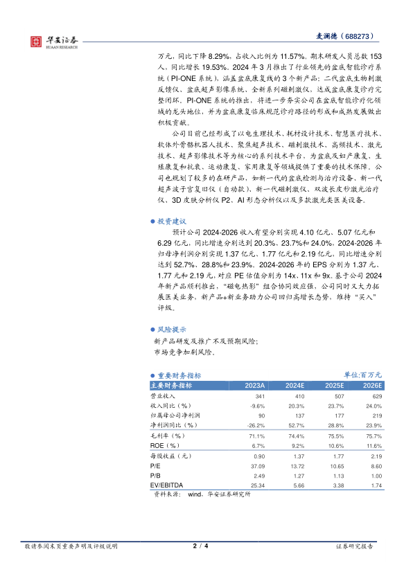预计公司2024-2026收入有望分别实现4.10亿元、5.07亿元和6.29亿元,同比增速分别达到20.3%、23.7%和24.0%,2024-2026年归母净利润分别实现1.37亿元、1.77亿元和2.19亿元,同比增速分别达到52.7%、28.8%和23.9%。2024-2026年的EPS分别为1.37元、1.77元和2.19元,对应PE估值分别为14x、11x和9x。基于公司2024年新产品顺利推出,“磁电热影”组合协同效应强,公司同时又大力拓展医美业务,新产品+新业务助力公司回归高增长态势,维持“买入”评级。