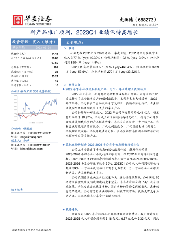 本报告通过对麦澜德公司2022年业绩和2023年第一季度业绩的分析,认为公司在新产品推广和研发投入方面取得了显著进展,股权激励计划为公司中长期发展提供了明确的目标。预计公司未来几年将保持快速增长,维持“买入”评级。同时,报告也提示了新产品研发风险和市场竞争风险。