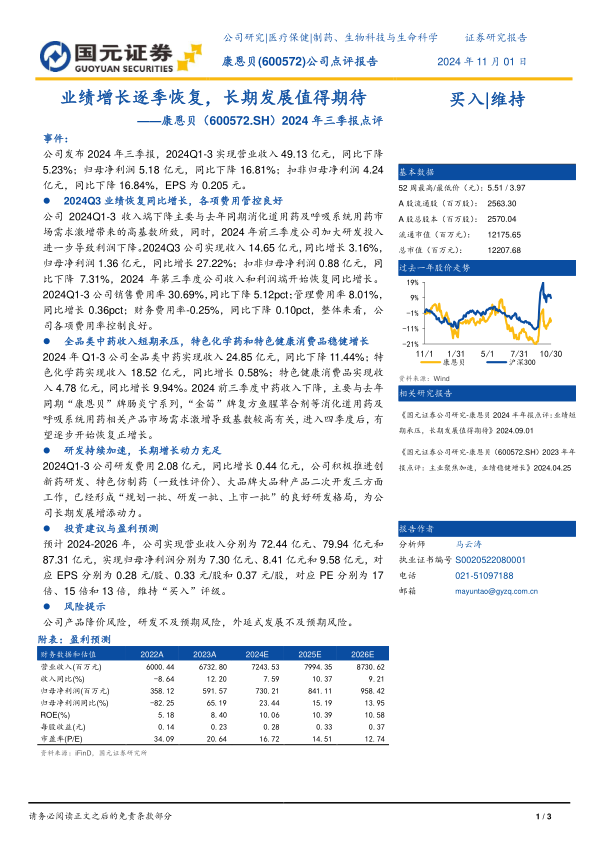 康恩贝公司在2024年前三季度面临高基数和研发投入增加带来的短期业绩压力,但第三季度已展现出明显的业绩复苏迹象,营收和归母净利润实现同比增长。公司在费用管控方面表现良好,销售费用率显著下降。尽管全品类中药业务短期承压,但特色化学药和特色健康消费品业务保持稳健增长,优化了产品结构。公司持续加大研发投入,积极推进创新药和仿制药的开发,为长期增长奠定了坚实基础。分析师维持“买入”评级,并对公司未来几年的营收和净利润增长持乐观预期,但同时提示了产品降价、研发不及预期和外延式发展不及预期等潜在风险。