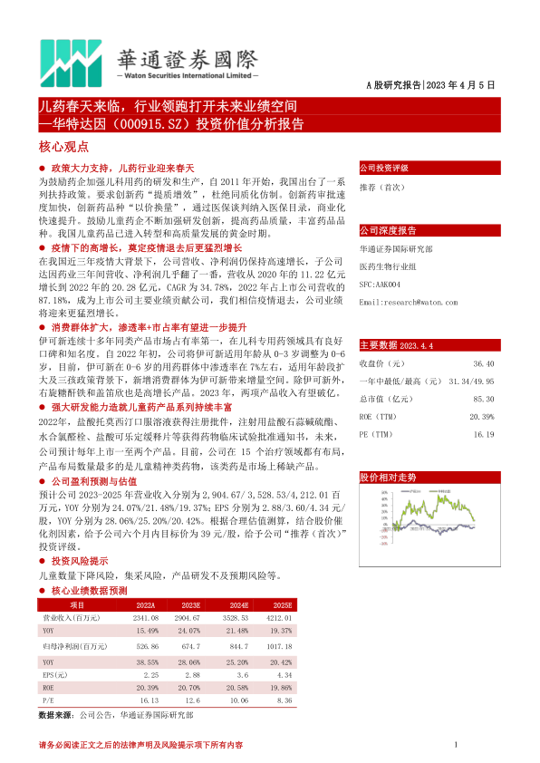 尽管面临近三年疫情的宏观挑战,华特达因的子公司达因药业仍保持了高速增长态势,其营收和净利润在三年间几乎翻番,营收从2020年的11.22亿元增长到2022年的20.28亿元,复合年均增长率(CAGR)高达34.78%,并在2022年贡献了上市公司总营收的87.18%,成为核心业绩驱动力。这一逆势增长不仅彰显了公司强大的经营韧性,也为疫情退去后门诊恢复和市场需求释放奠定了更猛烈的业绩增长基础。同时,公司持续投入研发,不断丰富儿童药产品系列,目前已在15个治疗领域进行布局,特别是市场上稀缺的儿童精神类药物,进一步巩固了其在儿童健康领域的领先地位。结合报告对公司2023-2025年营业收入和归母净利润的乐观预测,以及当前P/E(TTM)16.19和PEG 0.51的估值水平,报告首次给予华特达因“推荐”的投资评级,并设定六个月内目标价为39元/股,预示其未来股价具有显著上涨空间。