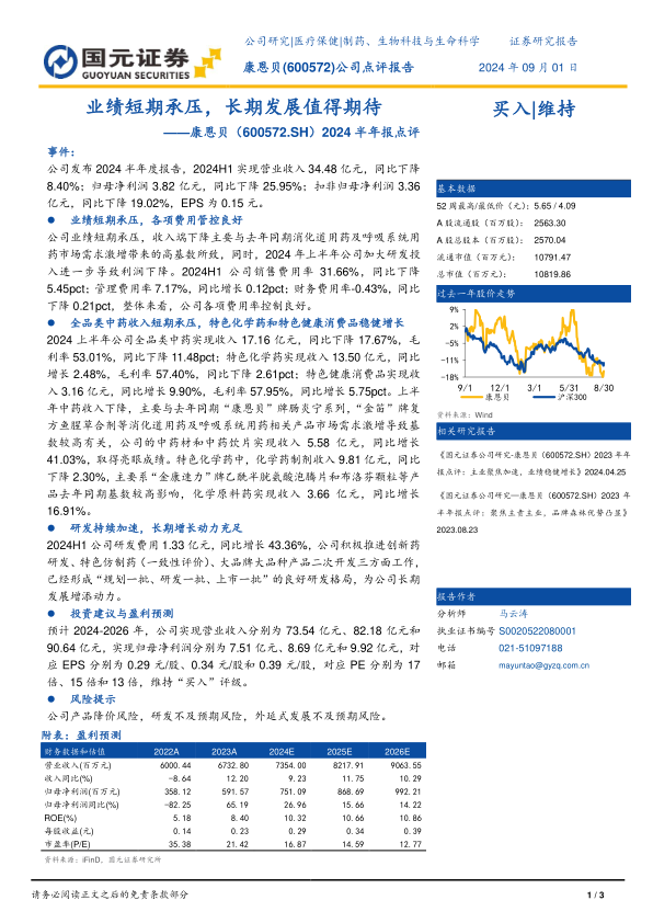 本报告对康恩贝(600572.SH)2024年半年度报告进行了分析,指出公司短期业绩受到高基数影响而承压,但各项费用管控良好。