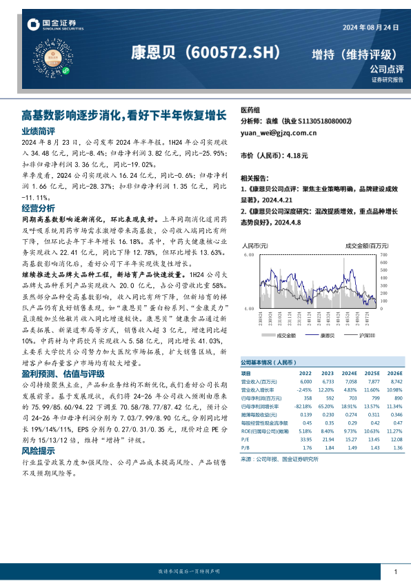康恩贝2024年上半年业绩受到同期高基数的影响,收入和利润同比有所下降,但环比表现良好,显示出恢复性增长的潜力。公司持续推进大品牌大品种工程,新培育产品快速放量,中药材与饮片业务增长迅速。虽然下调了未来收入预测,但维持“增持”评级,长期发展前景依然值得期待。投资者需要关注行业监管政策、产品成本以及销售情况等风险因素。