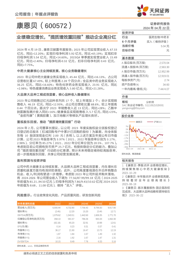 公司中药大健康主业持续发展、大品牌大品种工程成效显著,内生增长在质量和速度方面均有良好的表现;此外,公司高度重视潜在外沿并购整合机会,收入/利润有望进一步增厚。考虑到2023年公司外延并购未落地,将2024-2026年公司营业收入下调为77.56/87.99/99.18亿元(2024-2025年前值为81.21、94.50亿元),归母净利润为7.86/9.43/10.62亿元(2024-2025年前值为8.68、11.08亿元),维持“买入”评级。