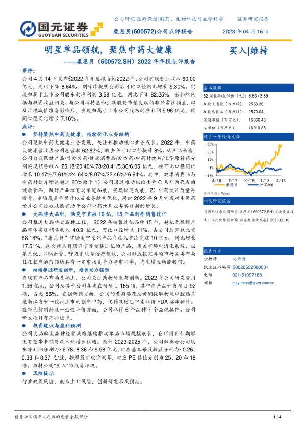 2022年年报点评报告:明星单品领航,聚焦中药大健康