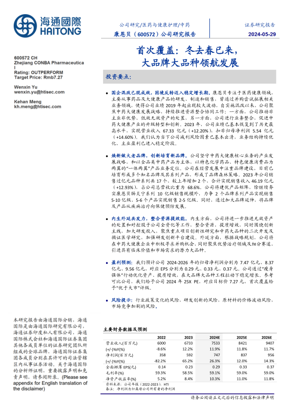 国企混改已现成效,困境反转迈入稳定增长期。康恩贝专注于医药健康领域,主要从事药品及大健康产品的研发、制造和销售,曾通过并购尝试拓展相关业务领域,使得公司业绩2019年起出现较大波动,自实施混改以来,公司聚焦中药大健康发展战略,持续推进资源整合协同工作:一方面,公司推动非主业非优势、低效无效资产的处置,另一方面,公司进行业务整合,促进中药大健康产业的升级转型和创新。2023年,公司业绩已基本恢复到了历史最高水平,实现营业收入67.33亿元(+12.20%),扣非归母净利润5.54亿元(+14.60%)。我们认为当下公司减利风险因素已基本出清,业务结构持续优化,主业盈利已进入稳定阶段。