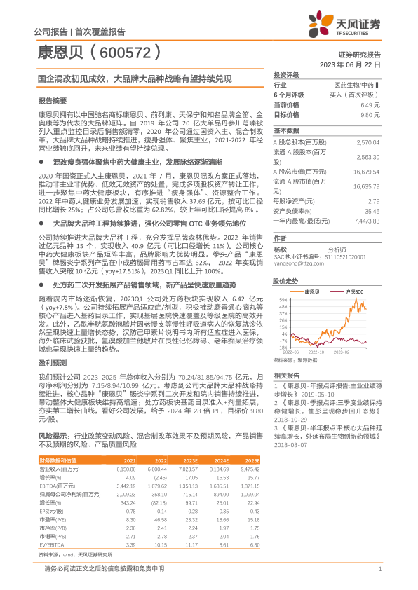 基于以上分析,我们给予康恩贝“买入”的首次评级,并基于2024年28倍PE,设定目标价为9.80元/股。
