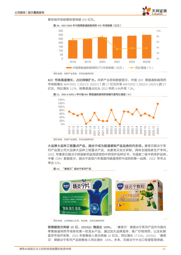 公司持续推进大品牌大品种工程,充分发挥品牌森林优势。 2022 年销售过亿元品种 15 个,实现收入 40.9 亿元(可比口径增长 11%)。 公司核心中药大健康板块产品矩阵丰富,品牌影响力优势明显。拳头产品“康恩贝”牌肠炎宁系列产品在中成药肠胃用药市占率达 62%, 2022 年实现销售收入突破 10 亿元(yoy+17.51%), 2023Q1 同比上升 100%。