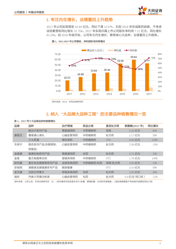 本报告分析了康恩贝2017年业绩及2018年一季度业绩,认为公司专注内生增长和聚焦核心大品种战略成效显著,OTC类大品种表现亮眼。但“两票制”导致销售费用率增加,同时考虑到股本增加,下调了盈利预测和目标价,维持“买入”评级。投资者应关注政策影响和处方药品种招标降价等风险。