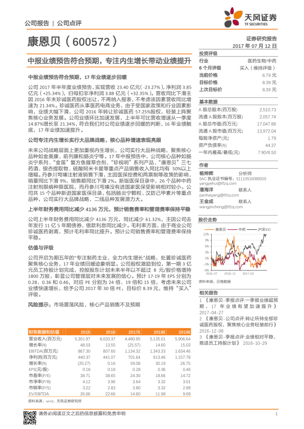 本报告分析了康恩贝2017年中报业绩预告,指出公司业绩符合预期,并通过剥离珍诚医药、聚焦核心品种等战略实现了业绩回暖。核心品种的快速增长、新进医保目录品种的潜力以及有效的成本控制,为公司未来的发展奠定了基础。维持“买入”评级,并给出目标价8.39元,反映了对公司未来业绩增长的信心。