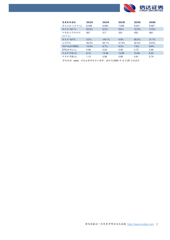 盈利预测:我们预计公司2024-2026年营业收入分别为75.08、84.31、95.67亿元,同比增速分别为9.6%、12.3%、13.5%,实现归母净利润为3.33、4.26、5.62亿元,同比分别增长4.9%、28.2%、31.7%,对应当前股价PE分别为14、11、8倍。