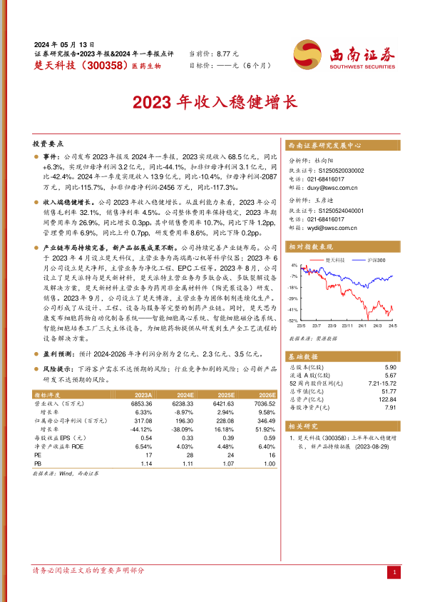 楚天科技2023年收入保持增长,但盈利能力下降,2024年一季度业绩承压。公司积极进行产业链布局和新产品拓展,为未来发展奠定基础。