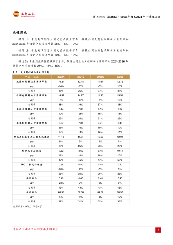 本报告对楚天科技(300358)2023年报及2024年一季报进行了分析,核心观点如下: