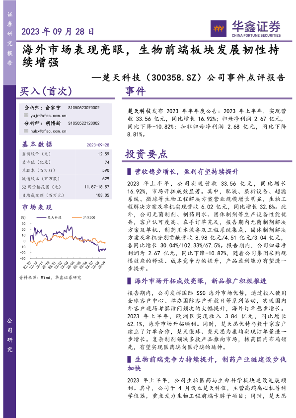 楚天科技在2023年上半年实现了营收的稳健增长,尤其在生物工程解决方案、制药用水装备等核心业务板块表现突出,并成功拓展了海外市场,欧洲区收入增长显著。尽管短期内净利润有所波动,但公司通过优化成本结构和强化集团采购效应,有望持续提升盈利能力。同时,公司在生物前端领域持续投入,通过设立新公司和推出创新产品,不断提升核心竞争力并深化制药产业链布局。鉴于其作为国内制药设备龙头企业的地位、完整的产业链优势以及生物前端的突出竞争力,分析师对公司未来发展持乐观态度,并给予“买入”评级,认为其新产品放量潜力巨大。