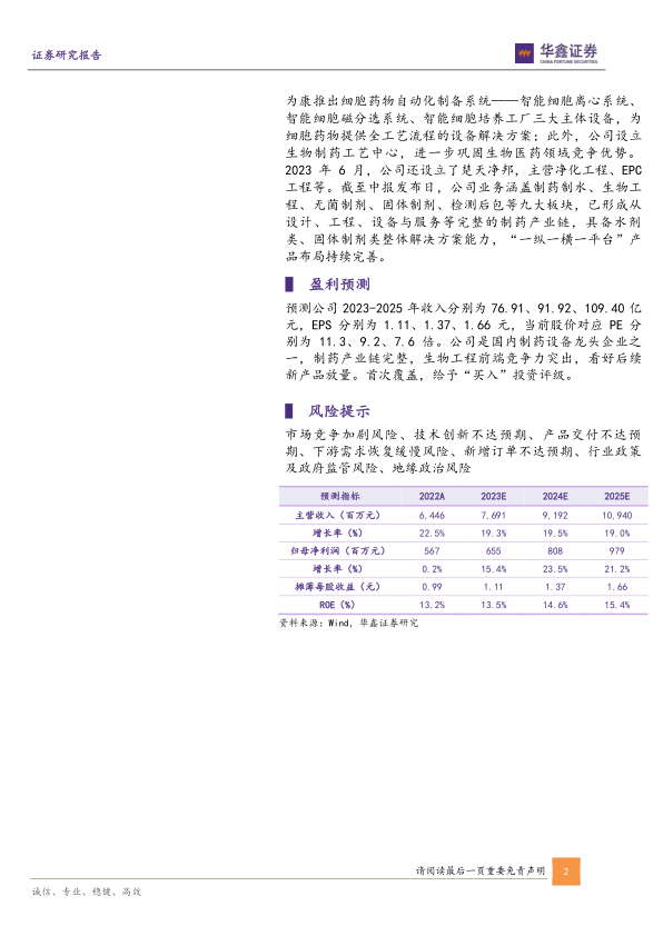 预测公司2023-2025年收入分别为76.91、91.92、109.40亿元,EPS分别为1.11、1.37、1.66元,当前股价对应PE分别为11.3、9.2、7.6倍。公司是国内制药设备龙头企业之一,制药产业链完整,生物工程前端竞争力突出,看好后续新产品放量。首次覆盖,给予“买入”投资评级。