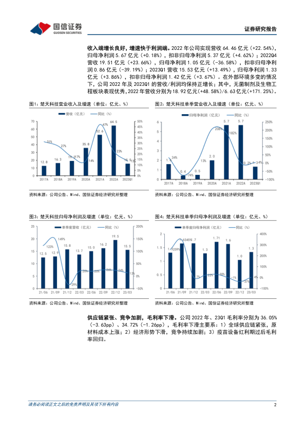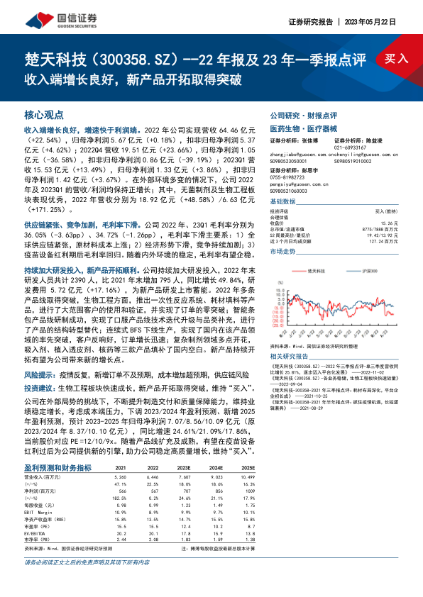 楚天科技在2022年及2023年第一季度展现出良好的营收增长态势,尤其在无菌制剂和生物工程板块表现突出,生物工程板块的营收贡献显著提升。尽管面临全球供应链紧张、原材料成本上涨和市场竞争加剧导致的毛利率下滑压力,公司通过持续加大研发投入,成功开拓了多条新产品线,包括生物工程的一次性系统、智能条包、连续式BFS以及复杂制剂领域填补国内空白的产品,为未来增长奠定了基础。分析师维持“买入”评级,并调整了盈利预测,认为随着产品线的扩充和成熟,公司有望在后疫苗设备红利时代实现稳定高质量增长。