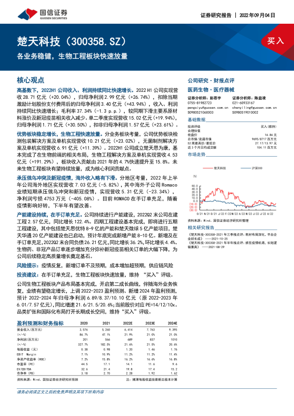 投资建议:在手订单充足,生物工程板块快速放量,维持“买入”评级。公司生物工程板块产品布局基本完成,开启第二成长曲线,伴随海外业务恢复,业绩有望稳定增长,上调2022-2023盈利预测、新增2024年盈利预测,预计2022-2024年归母净利润6.89/8.37/10.10亿元(原2022-2023年6.01/7.57亿元),同比增速21.6/21.5/20.6%;当前股价对应PE=14/12/10x。品类扩张和国际化布局打开长期成长空间,维持“买入”评级。