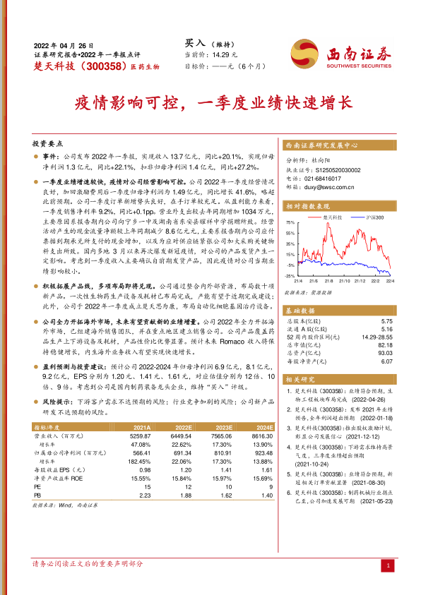 楚天科技一季度业绩表现亮眼,疫情影响可控,显示出公司强大的经营能力。同时,公司积极拓展产品线,布局海外市场,有望在未来实现新的增长。