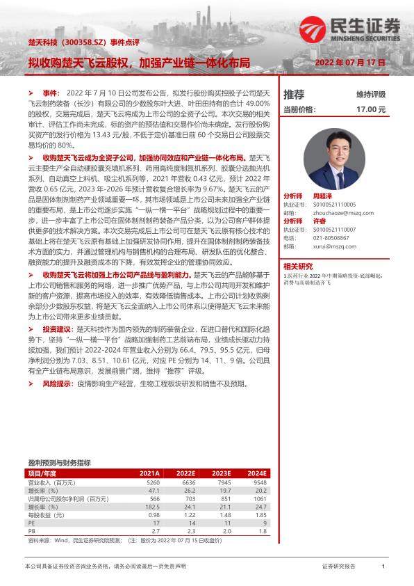 事件:2022年7月10日公司发布公告,拟发行股份购买控股子公司楚天飞云制药装备(长沙)有限公司的少数股东叶大进、叶田田持有的合计49.00%的股权,交易完成后,楚天飞云将成为上市公司的全资子公司。本次交易的相关审计、评估工作尚未完成,标的资产的预估值和交易作价尚未确定。发行股份购买资产的发行价格为13.43元/股,不低于定价基准日前60个交易日公司股票交易均价的80%。
