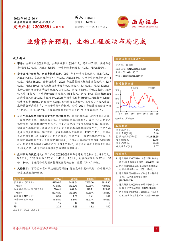 楚天科技在2021年取得了卓越的财务表现,营收和净利润均实现大幅增长,盈利能力显著增强,这主要得益于其在高端客户市场的成功拓展和产品结构的优化。公司在生物工程领域的战略布局已基本完成,通过对一次性耗材、填料及细胞治疗设备等关键环节的投资和整合,显著提升了其整体解决方案能力,为未来的持续增长奠定了坚实基础。尽管存在下游需求、行业竞争和新产品研发等风险,但作为制药装备行业的领军企业,楚天科技的未来发展潜力依然值得市场关注。
