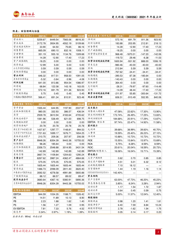 根据预测,公司2022年至2024年的归母净利润将分别达到6.9亿元、8.1亿元和9.2亿元,对应的每股收益(EPS)分别为1.20元、1.41元和1.61元。基于这些盈利预测,对应的估值(PE)分别为12倍、10倍和9倍。鉴于楚天科技作为国内制药装备龙头企业的市场地位和持续的业务拓展,报告维持对其“买入”的投资评级。