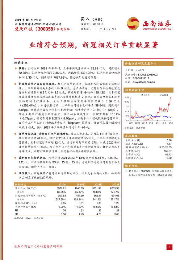 2021年半年报点评:业绩符合预期,新冠相关订单贡献显著