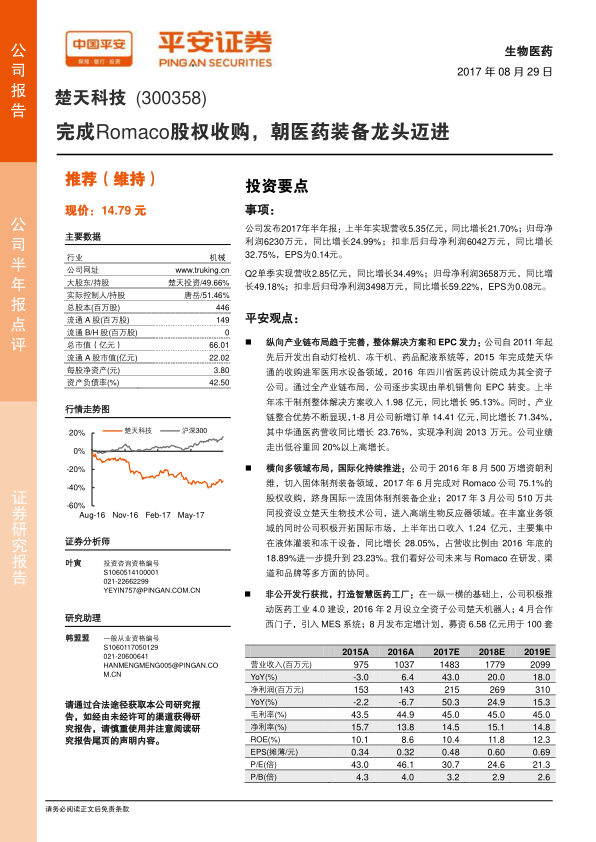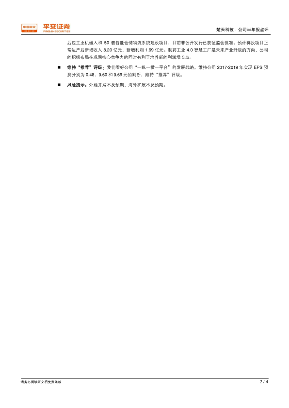 楚天科技通过完善纵向产业链、拓展横向多领域,并积极推进国际化和智慧医药工厂建设,实现了业绩的稳健增长。平安证券看好公司的发展前景,维持“推荐”评级,并认为公司“一纵一横一平台”的发展战略将持续推动公司发展。同时,报告也提示了外延并购和海外扩展不及预期的风险。