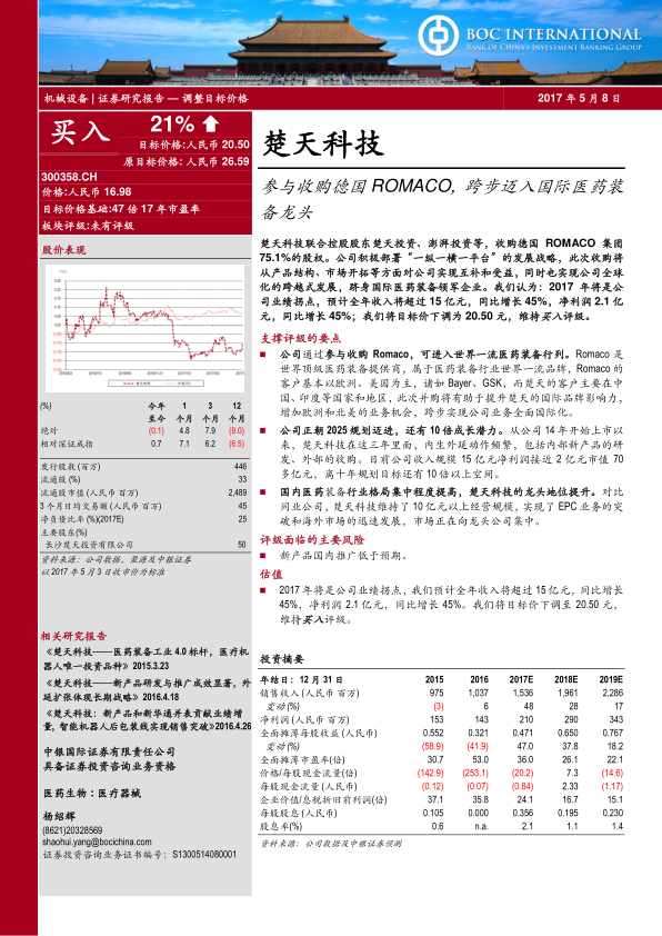 本报告分析了楚天科技参与收购德国 Romaco 集团的事件,认为此次收购是公司实施“一纵一横一平台”战略的重要一步,将有助于提升公司的国际竞争力,完善产业链,实现全球化发展。报告维持买入评级,但将目标价下调至 20.50 元,并提示了新产品国内推广低于预期的风险。