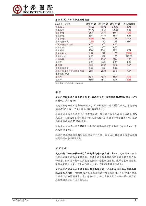 楚天科技已经成为中国最大的制药装备供应商,尤其是在水剂类制药装备领域占据龙头地位,Romaco 的产品在楚天科技的规划范围内,可以和公司原主业形成很好的协同效应。本次并购合作,将大步推动楚天一纵一横一平台发展战略的推进和产业链的完善。
