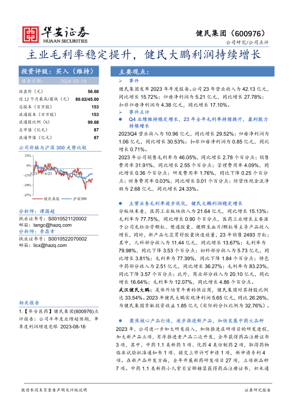 主业毛利率稳定提升,健民大鹏利润持续增长
